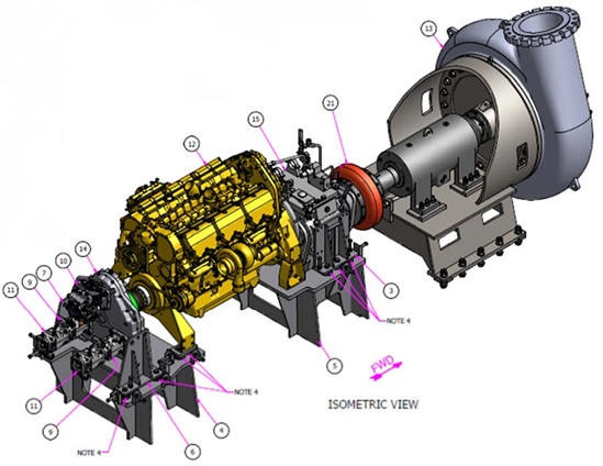 The machinery package consists of the dredge pump, dredge pump coupling, dredge pump stub shaft, marine gear, engine, hydraulic stub shaft, hydraulic coupling and hydraulic pump drive.